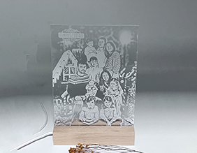 Foto grabada en laser sobre metacrilato transparente de 5mm y con una base de luz leeds.